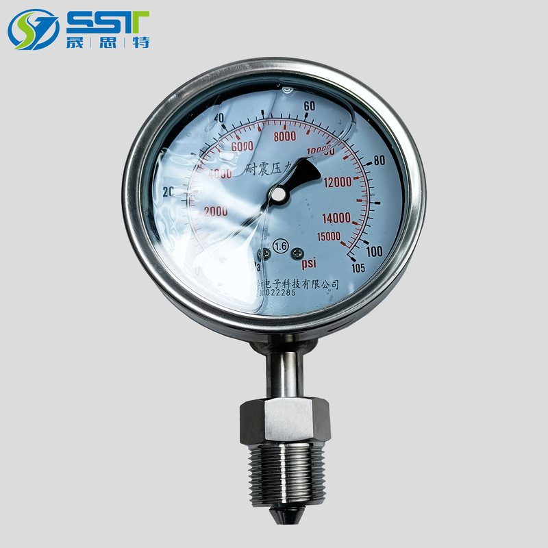 井口压力表具有耐高压,压力可达105MPa,采用活动螺纹安装方式,更加方便安装,抗震性好,压力表内注油,全部不锈钢外壳,出厂前经过严格压力测试。
